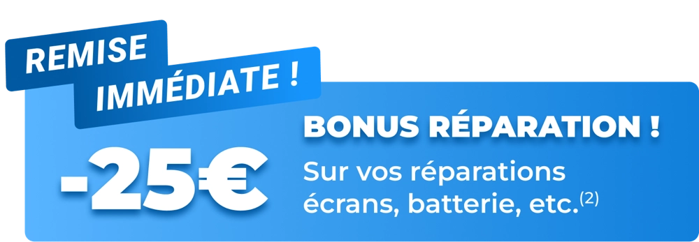 (1) Le bonus réparation Qualirepar n’est valable que sur le territoire Français sous condition d’acceptation par les éco-organisme selon l’éligibilité du produit et de la panne. L’éligibilité est testée et vous sera confirmée en point de vente par nos techniciens au moment du rendez-vous réparation. Voir conditions sur label-qualirepar.fr